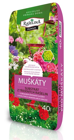 Substrát pro muškáty je vyroben z kvalitní tříděné rašeliny s přídavkem minerálních hnojiv a vápenaté složky. Je určen pro přesazování a pěstování muškátů - pelargónií, a i ostatních balkónových květin s podobnými požadavky. Je vhodný k pěstování muškátů v květináčích, balkónových (okenních) truhlících i kameninových korytech.